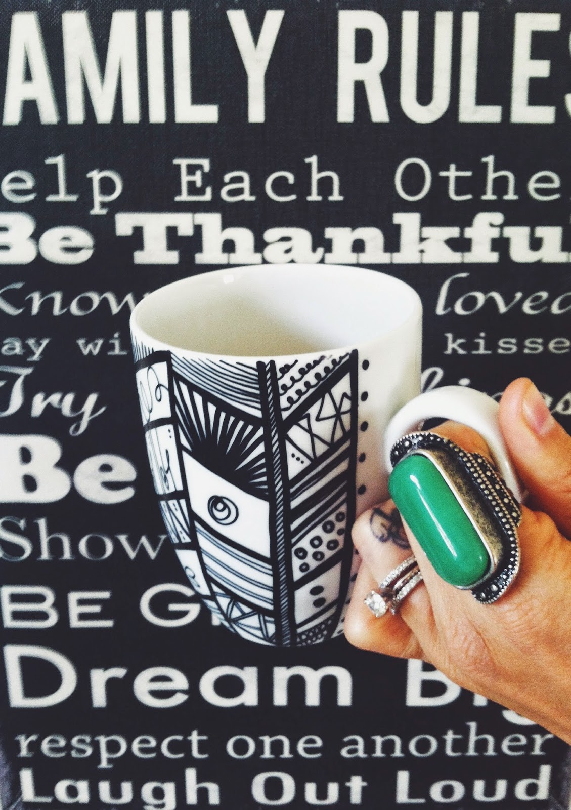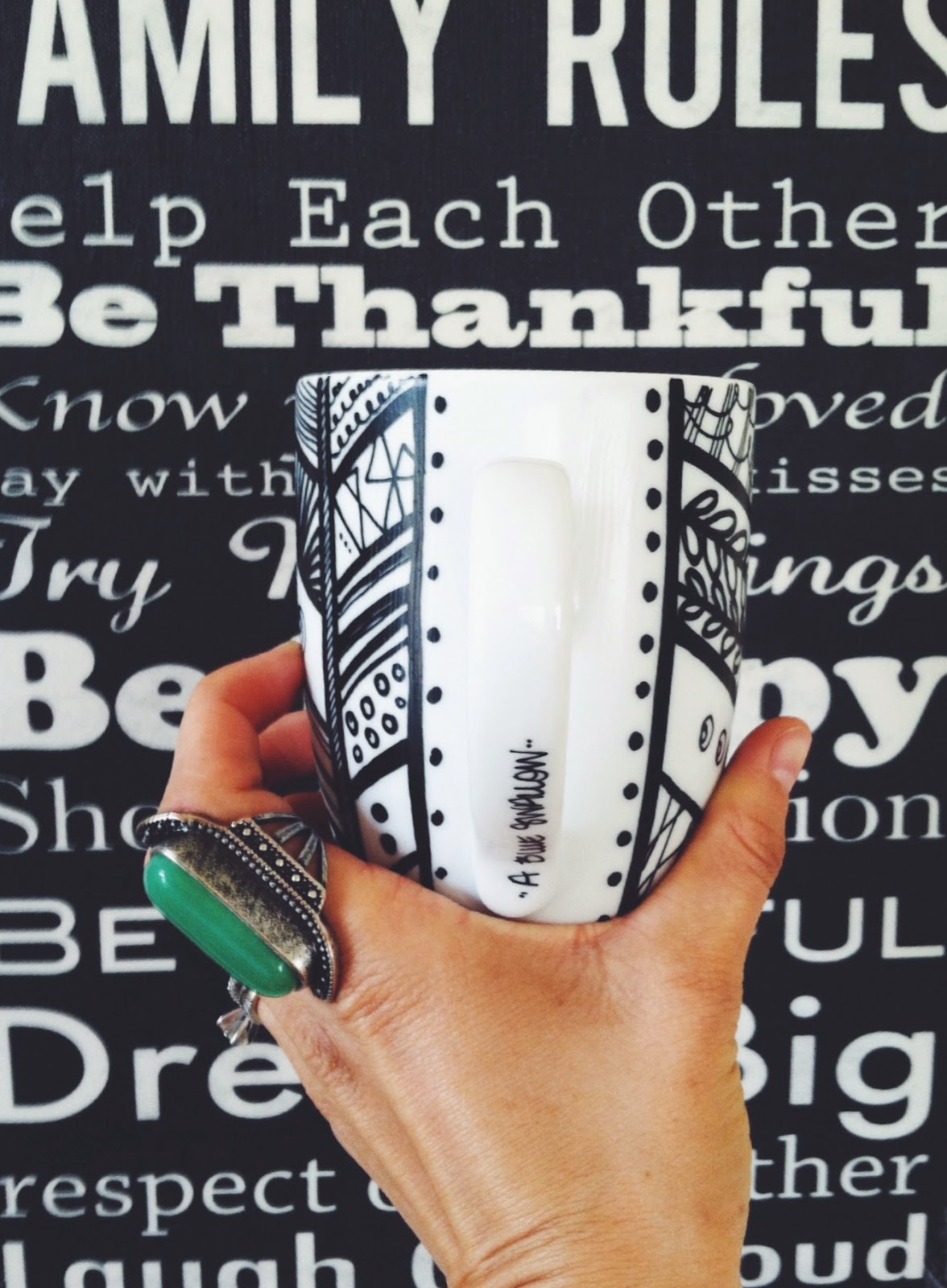 Hi ladies, I wanted to share these adorable custom made and hand made mugs with you all!! A Blue Swallow makes all sorts of beautiful designs. Go check out there shop here to see more. This adorable Aztec mug with has a hand painted feather motif design combined with lines, shapes, and dots! I love it!! This is my new favorite mug to have my morning coffee in...and we all know coffee is a mama must have! A Blue Swallow makes these microwave and dishwasher safe so you dont have to worry about losing the beautiful design. The owner of the shop, Carmen, is such a sweety and i relate to her so much! Heres what she has to say: