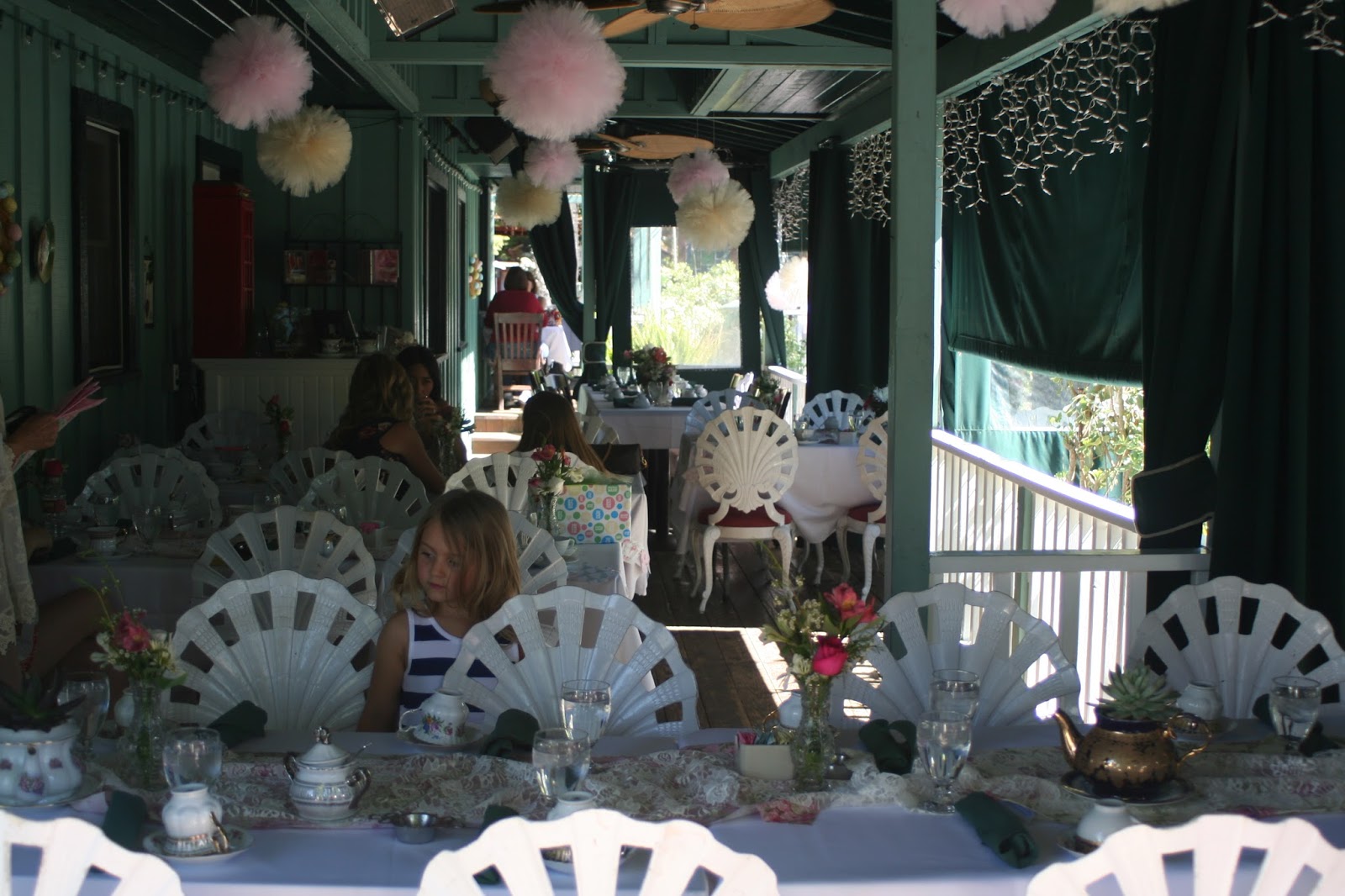 A couple weeks ago my mom threw my sister and I the sweetest garden tea party baby shower for our sweet little girls at the San Juan Tea House on Los Rios Street. As I've mentioned in the past my sister and I are 5.5 weeks apart in our pregnancies, and this being both our second pregnancies and our first daughters we knew it would be fun to do a combined shower, with just us and our girlfriends and a couple family members.  I have always wanted both a boy and a girl, but I knew the moment I found out we were having a daughter that I would be able to go nuts with flowers, glitter, lace, and all things feminine! So a garden tea party full of flowers and dainty tea cups was exactly what we needed.  My mom did all of the floral center pieces, shes insanely gifted and so creative and insisted she do them herself.  She also brought in some cute collector tea pots to put the center pieces in, some adorable lace and patterned tea pot fabric for table runners, and some vintage vases.  The restaurant served us a 4 course high tea meal which consisted of an assortment of finger sandwiches, delicious heart shaped scones with creamed butter and jam, a selection of teas, and topped us off with a selection of desserts. YUM.  I had a couple things in mind I thought would be cute finishing touches, so I partnered with a few shops to help out in achieving the feminine shabby chic look we were going for.  See all the details below: